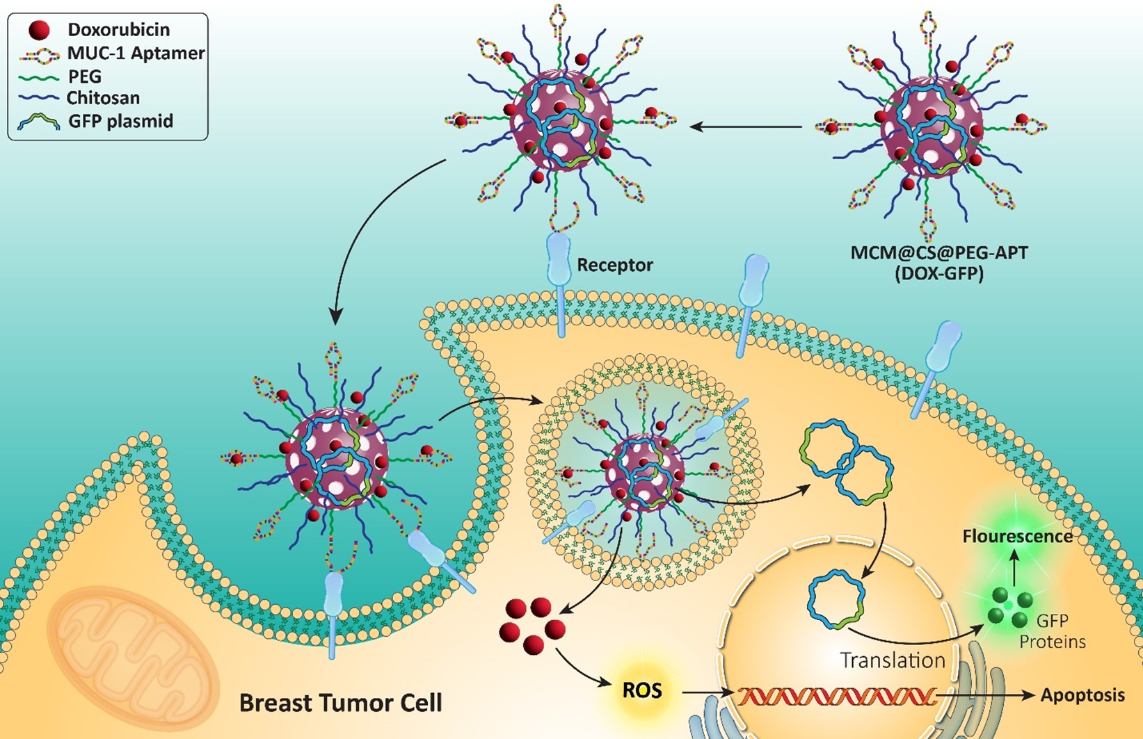 71- Smart co-delivery of plasmid DNA and doxorubicin using MCM-chitosan-PEG polymerization functionalized with MUC-1 aptamer against breast cancer (Link) (pdf)