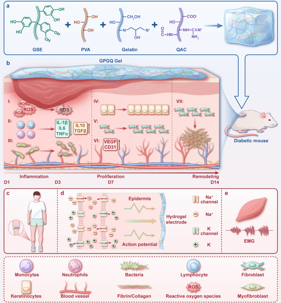 102- Mechanoadaptive conductive hydrogels with dual functionalities for epidermal sEMG monitoring and diabetic wound healing (Link) (pdf)